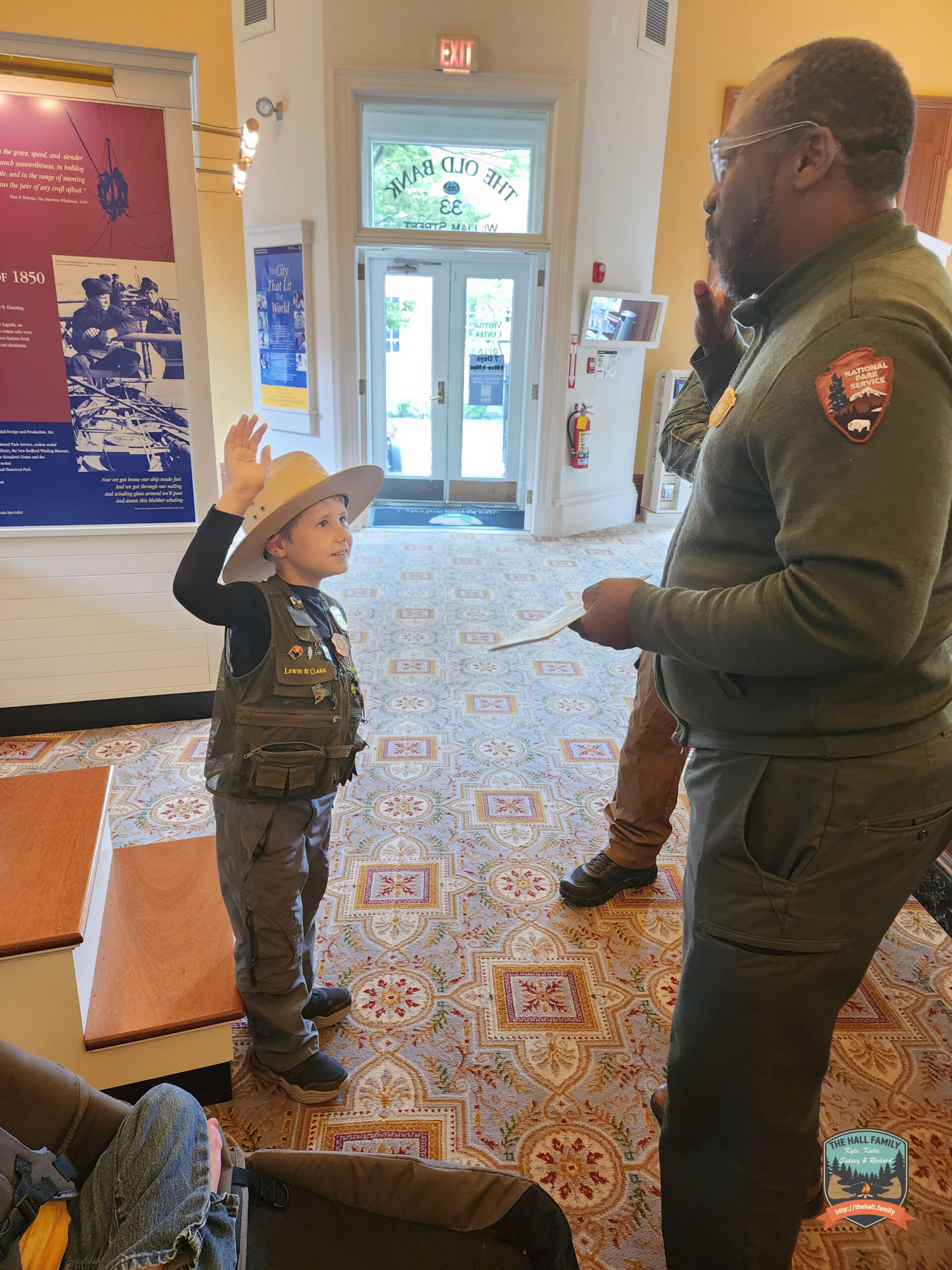 Once completed, we went back to the National Historical Park to turn in the Junior Ranger booklet. The Park Ranger came out, asked Sidney some questions about the booklet, then let Sidney wear his Ranger hat while he swore Sidney in as a new Junior Ranger. Sidney has completed quite a few different Junior Ranger programs but hasn’t had this level of officialness when completing. It was pretty cool.